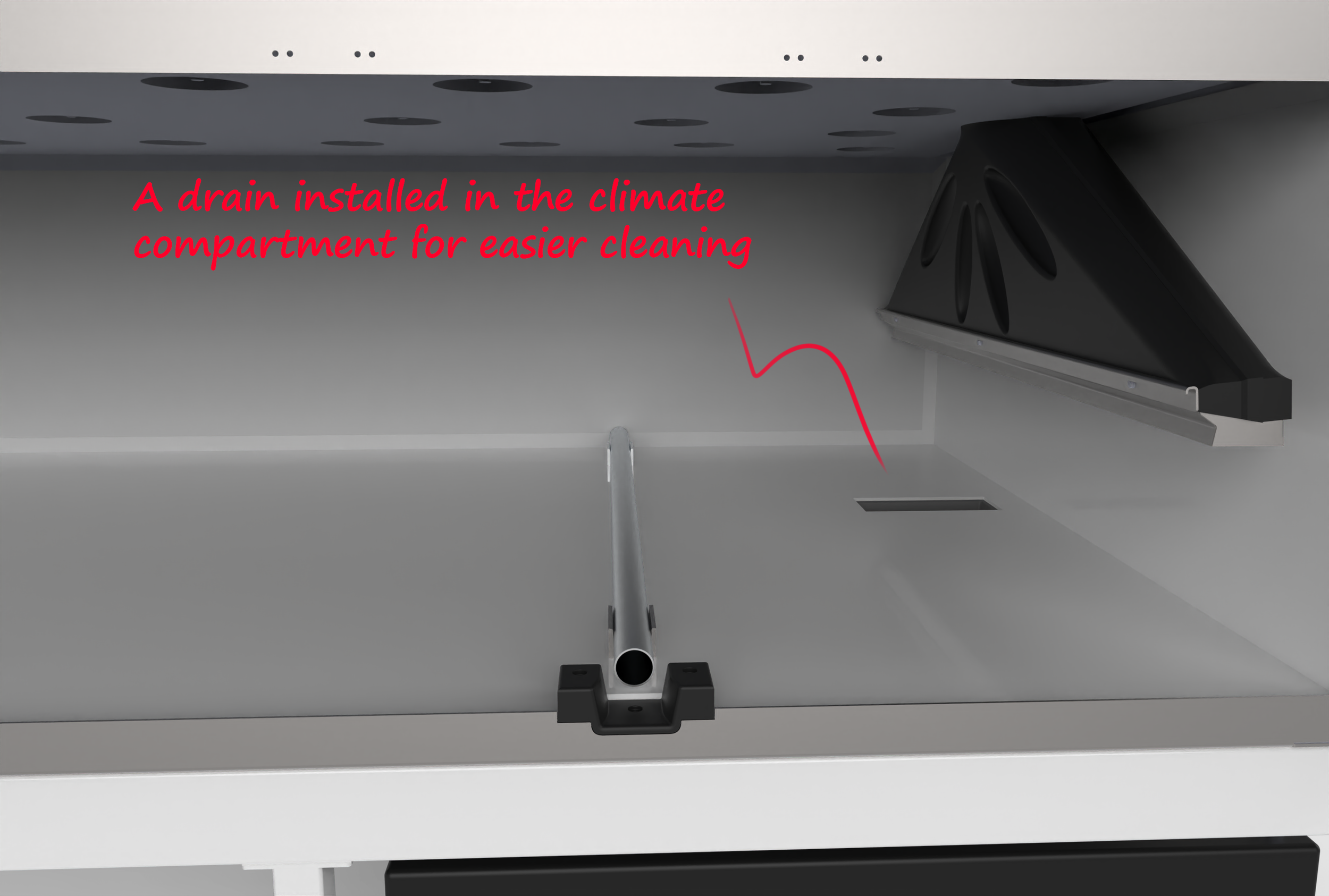 The climate chamber is equipped with its own drainage, facilitating easy cleaning and rinsing.